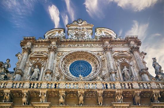 Lecce glänzt mit seinen üppig verschnörkelten Barockfassaden von Palazzi und Kirchen in honiggelbem Tuffstein, der im Umland abgebaut wird und bis heute ein wertvolles Exportgut darstellt. Das renommierteste Beispiel des Barockstils von Lecce ist neben der Kathedrale an der Piazza del Duomo die Fassade der Basilica di Santa Croce: Sehr phantasiereich gestaltete Giuseppe Zimbalo, einst einer der wichtigsten Barocksteinmetzen der Stadt, seine Allegorien mit Engeln, Untieren und Fabelwesen.