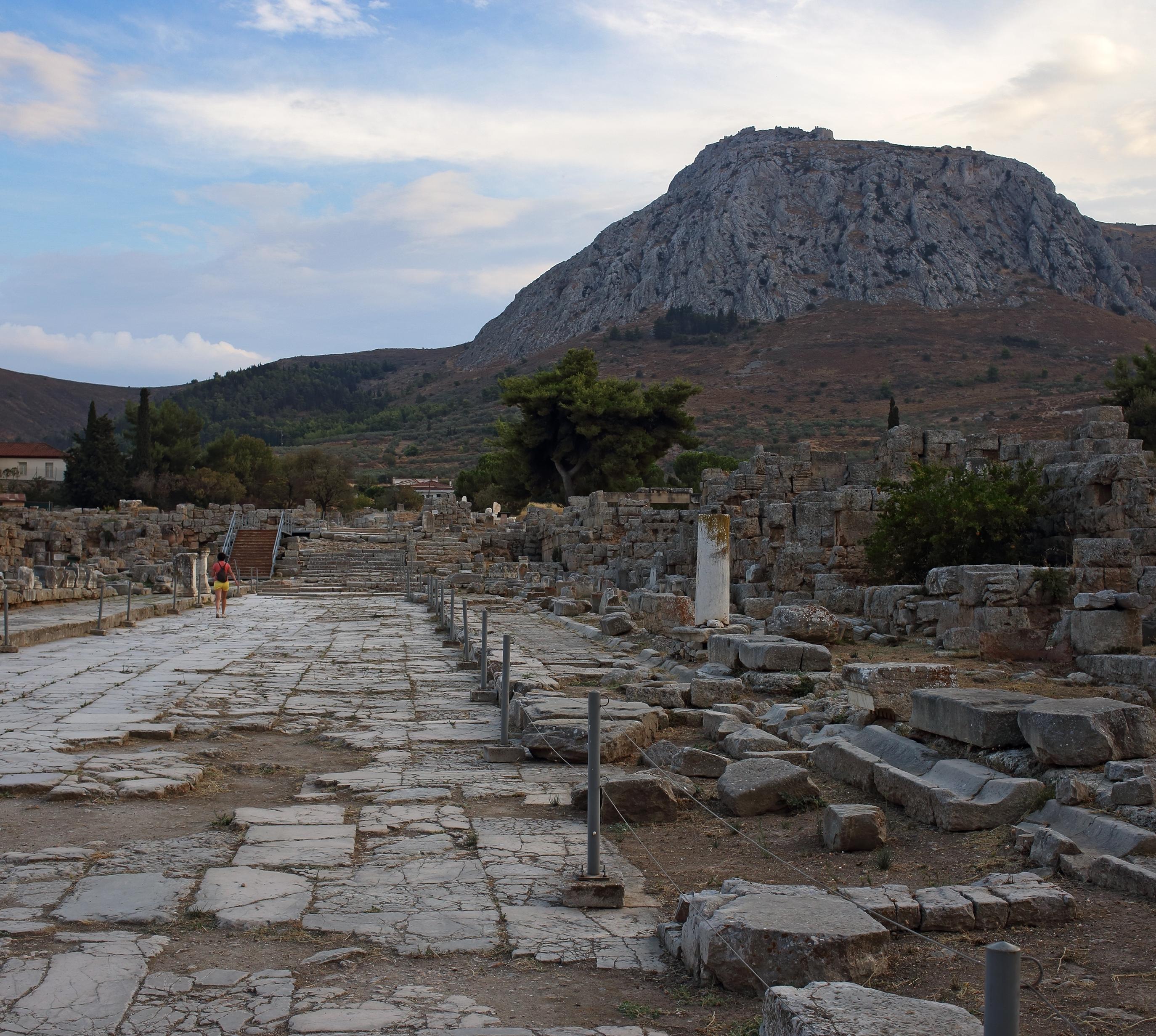 Aus der Küstenebene von Korinth erhebt sich ein mächtiger, 575 m hoher Fels, auf dem die Mauern und Zinnen einer weitläufigen Burganlage zu erkennen sind. Sie stammen aus fränkisch-byzantinischer, venezianischer und türkischer Zeit und sind teilweise auf Quaderreihen aus der Antike errichtet. Der einzige Zugang im Westen der Festung ist durch einen dreifachen Mauerring mit drei Toren besonders stark gesichert. In der Antike standen in Akrokorinth mehrere Tempel, von denen heute jedoch keine nennenswerten Spuren mehr erhalten sind. Auf dem höchsten Punkt des Felsens wurde der Liebesgöttin Aphrodite gehuldigt. Zwei Stunden sollten Sie für einen Rund- gang unbedingt veranschlagen, es lässt sich aber auch gut noch mehr Zeit hier oben verbringen. Der Fernblick ist grandios, im Spätwinter bis in den Frühsommer hinein blühen Abertausende von Wildblumen. Besucher sind rar und die Stille betäubt die Sinne.