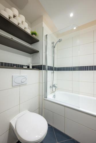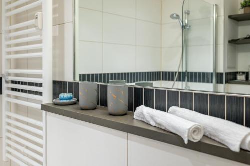 Diese Ferienwohnung mit Stadtblick hat Parkettböden und 1 Schlafzimmer sowie 1 Badezimmer mit einer Dusche, einer Badewanne und kostenlosen Pflegeprodukten. Die Küche ist ausgestattet mit einem Kühlschrank und einer Mikrowelle, einer Herdplatte sowie einer Kaffeemaschine und einem Wasserkocher.