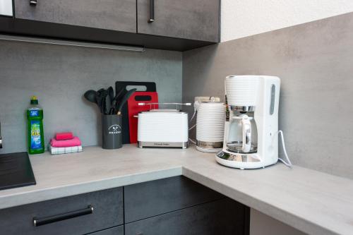 Alle Wohneinheiten sind ausgestattet mit einem Kühlschrank, einem Geschirrspüler, einer Kaffeemaschine, einem Ofen und einem Wasserkocher.