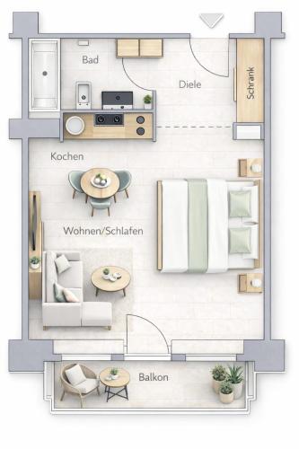 Diese Ferienwohnung besteht aus 1 Schlafzimmer, einer Küche und 1 Badezimmer.