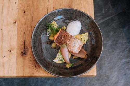 In den Restaurants mit ihrem gemütlichen Tiroler Ambiente und auf der großen Terrasse am See können Sie eine Vielzahl an regionalen und internationalen Gerichten genießen. Als Spezialität des Hauses gilt frischer Fisch aus den hoteleigenen Teichen. Die Preise für Halbpension umfassen ein 6-Gänge-Menü am Sonntag.