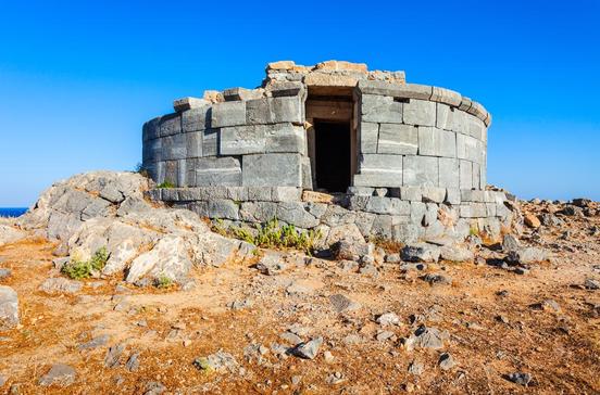 Der Rundbau auf der Landzunge im Nordosten der Bucht von Líndos stammt wohl aus hellenistischer Zeit. Er hat einen Durchmesser von 9 m und ist ganz ohne Mörtel aus sorgfältig behauenen Steinen zusammengefügt worden. Ein schmaler Pfad führt dich zu Fuß in etwa einer Stunde durch völlig unverbaute Natur dorthin. Er beginnt am Restaurant Palestra am Nordrand des Hauptstrands von Líndos. Unterwegs kommst du auch an einer Windmühle vorbei.