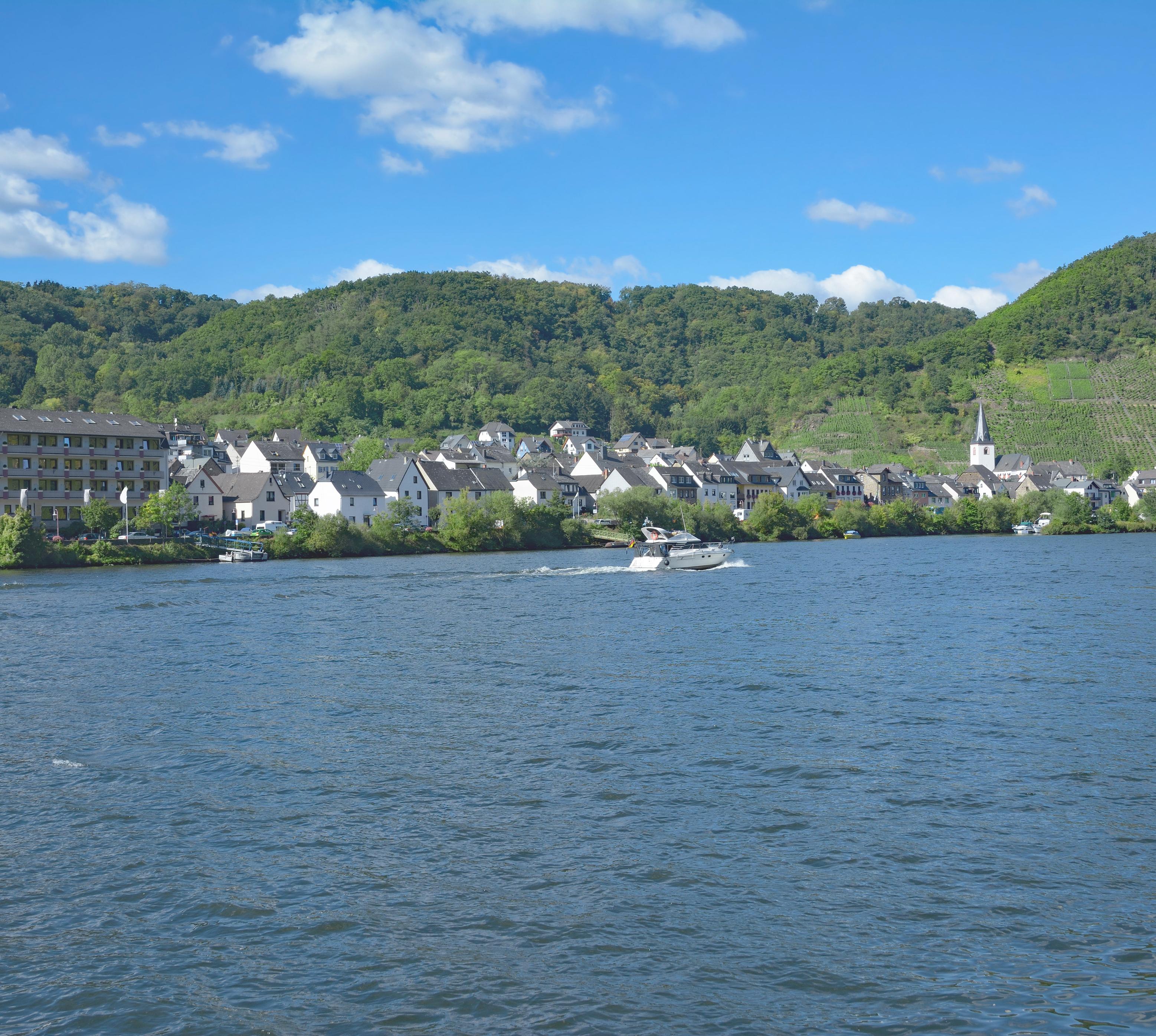 Hier ist die Mosel breit. Von den Cafés am Ufer aus betrachtet, wirkt sie wie ein See. Das Dorf (700 Ew.) war früher eine keltische Siedlung. Hoch über ihm wacht die imposante Burg Thurant. Ende des 12.Jhs. wurde sie vom Kreuzfahrer und Pfalzgrafen Heinrich auf antiken Fundamenten errichtet. Heute sind Teile von ihr Ruinen. Natürlich führt nun eine moderne Straße hinauf, aussichtsreicher und entschleunigender ist allerdings die Wanderung auf dem Moselsteig. Oben angekommen erwarten dich Giebeldächer und ein Steingarten mit barocken Skulpturen ,umringt von Blumen und Sträuchern. Sehenswerte „innere Werte“ sind Verlies, Kapelle, Jagdzimmer und Weinkeller, doch die größte Burgenattraktion ist der Weitblick in die Landschaft. Das Dorf zu Füßen der Burg zieht sich an der Uferstraße entlang. Die Reste seiner Stadtmauer samt Zoll- und Signalturm, die mittelalterlichen Höfe und andere stille Nischen zu erkunden lohnt sich. Am Ortsrand wird im familiären und liebevoll geführten Landhaus Zimmermann bodenständige Küche serviert. Dank hausgemachter Gemüsemaultaschen müssen selbst Veganer nicht hungrig bleiben.