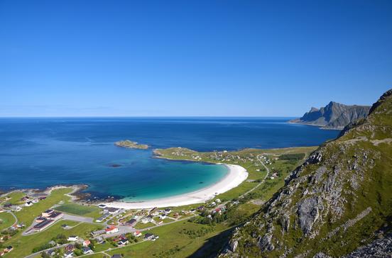 Fast 2 km lang, bis zu 300 m breit, so fein und weiß wie Puderzucker und von einer markanten Klippe geteilt – Haukland ist die Strandsensation der Lofoten. Landeinwärts geht die blendend weiße und in Dünen gefasste Fläche ins satte Grün eines weit ausladenden Wiesentrogs über, flankiert von zartgrün bemoosten Steilwänden. Und im Norden erhebt sich das beeindruckende Massiv des 965 m hohen Himmeltind erhebt.