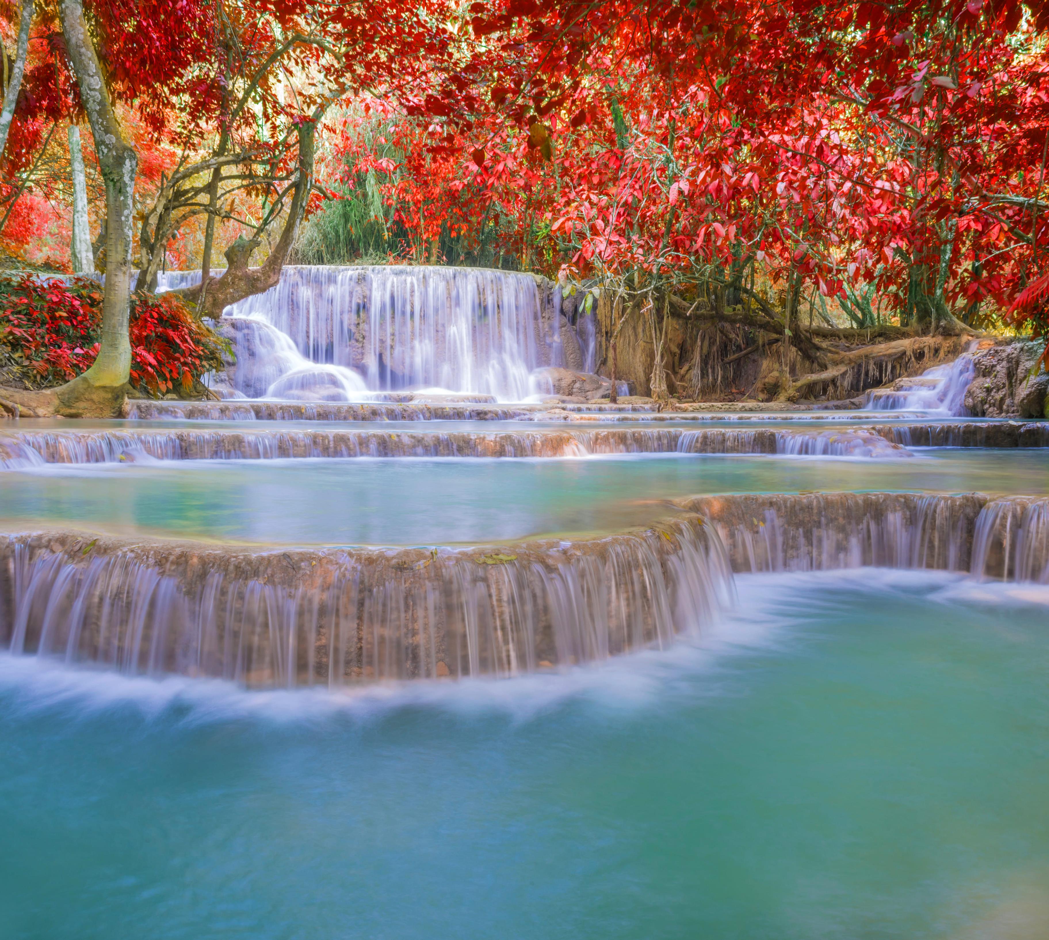 Malerisch stürzen sich hier die Wassermassen des Kuang Xi über den Kalkstein in die Tiefe. Über Fallhöhen von bis zu 30 Meter fließt das Wasser durch den üppigen Dschungel durch türkisblaue Becken hangabwärts. Einige Stellen sind gut zum Baden geeignet.