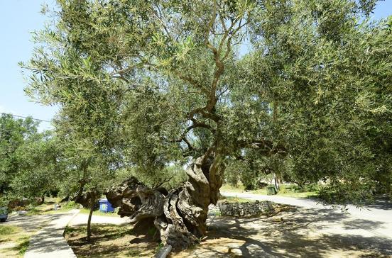 Die Platía des Binnendorfs mit ihrer riesigen, uralten Platane liegt an der Inselrundstraße. Von hier aus gelangt man auch zu den nur 50 m entfernten, über zwei Dutzend venezianischen Zisternen, die direkt neben der Hauptstraße in Richtung Volimés auf einem Feld stehen. Sie sind allerdings viel schlechter erhalten als die von Agalás.