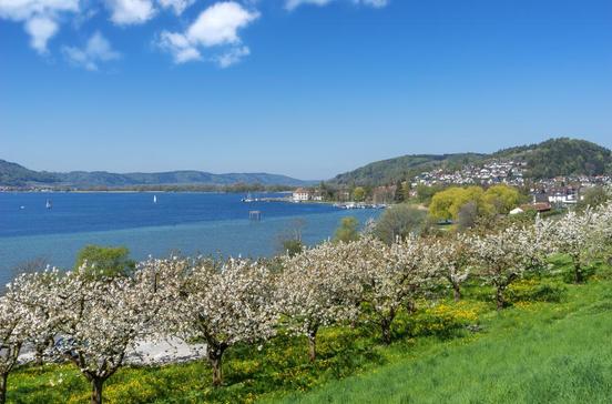 Erholungsort am Südwestufer des Überlinger Sees. 753 fränkischer Königshof, 9.Jh. karolingische Kaiserpfalz. Der Bodensee verdankt diesem Ort seinen Namen.
