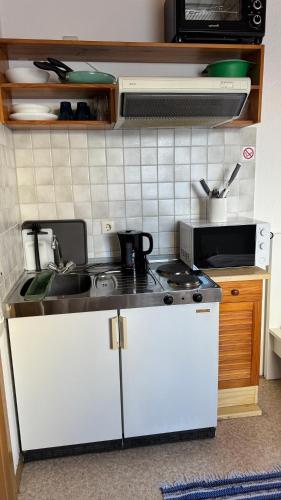 Eine voll ausgestattete Küchenzeile und ein eigenes Badezimmer sind vorhanden.