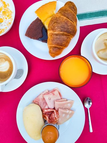 Jeden Morgen wird ein süßes und herzhaftes Frühstück angeboten. Es umfasst heiße Getränke, Croissants und Aufschnitt.