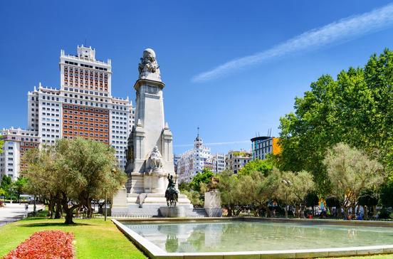 Auf dem großen Platz am westlichen Ende der Gran Vía verlieren sich die Passanten zwischen überwiegend nüchternen Zweckbauten und einem ununterbrochenen Verkehrsstrom an allen vier Rändern. Doch die Madrider - ganz Großstädter - treffen sich hier trotzdem gern. In der Mitte des Platzes reitet seit 1928 Spaniens heimlicher Nationalheld Don Quijote auf seinem Pferd Rosinante, natürlich begleitet von Sancho Pansa. In ihrem Rücken blickt Miguel de Cervantes streng auf seine Romanfiguren hinab. Auffällige Gebäude sind das 25-stöckige Edificio España von 1953 an der Nordostseite des Platzes, das derzeit leersteht, und daneben die Torre de Madrid, ein 1957 fertiggestellter, 142 m hoher Wohnturm.