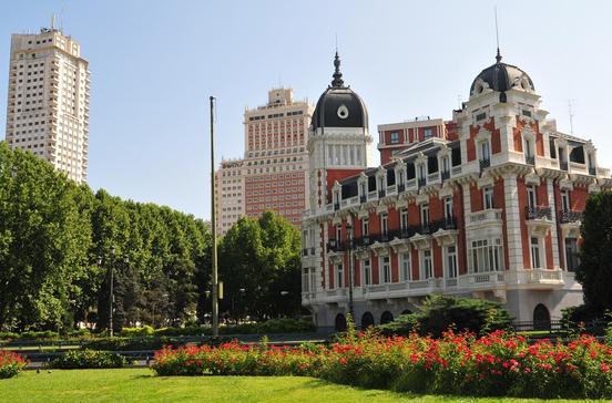 Auffällige Gebäude am großen Spanienplatz am westlichen Ende der Gran Vía sind das 28-stöckige Edificio España von 1953 an der Nordostseite des Platzes und daneben die Torre de Madrid, ein 1957 fertig gestellter, 130 m hoher Wohnturm.