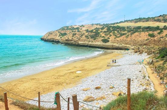 Eine sanft geschwungene Bucht, rechts eine Mole, links eine kleine Landzunge und dazwischen ein sauberer weißer Sandstrand mit türkisem Wasser. Obwohl der große Hafen Tanger Med. um die Ecke liegt, ist das Wasser aufgrund der Strömungsverhältnisse sauber, der Strand selten überfüllt, und ein paar kleine Cafés und Restaurants gibt es auch, damit der Besucher nicht ganz auf dem Trockenen sitzt.