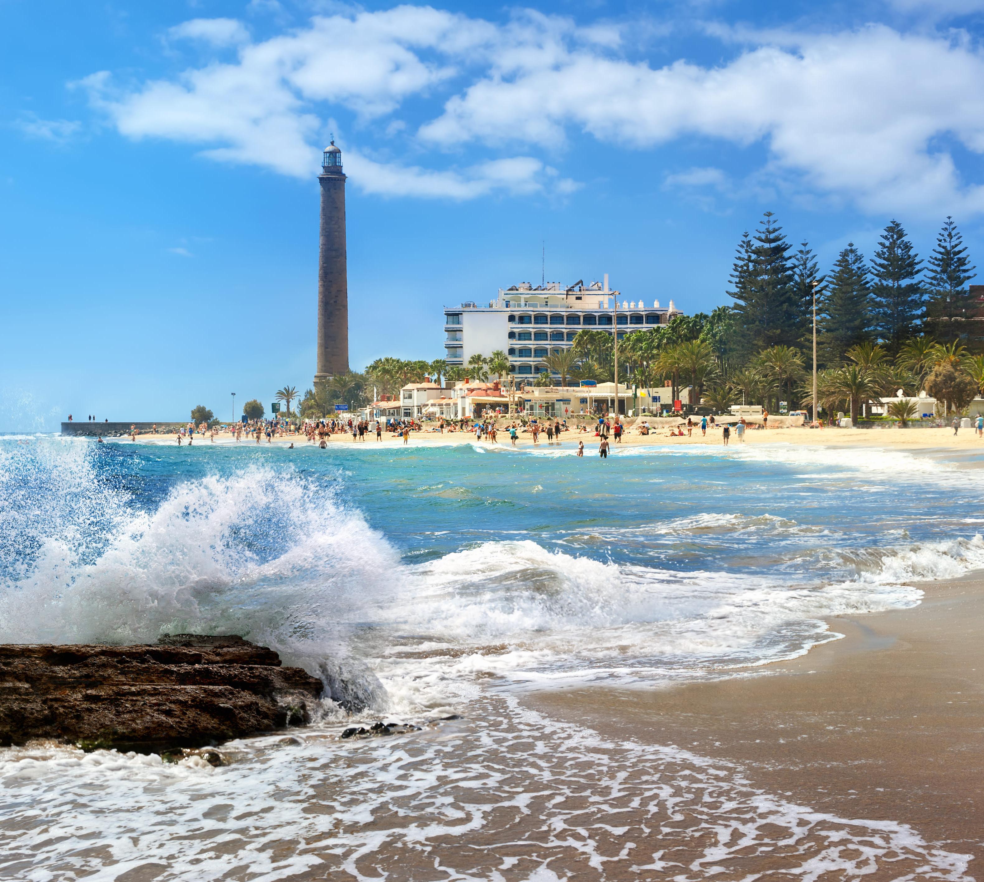 Unterhalb von Playa del Inglés und begrenzt von Dünen, einem uralten Palmenhain und dem Leuchtturm Faro de Maspalomas liegt diese weitläufige Siedlung. Maspalomas wird im Landesinnern von weiteren Feriensiedlungen eingerahmt. Die Strandpromenade mit Cafés, Eisdielen und Einkaufszentren zieht sich bis nach Las Meloneras hin.