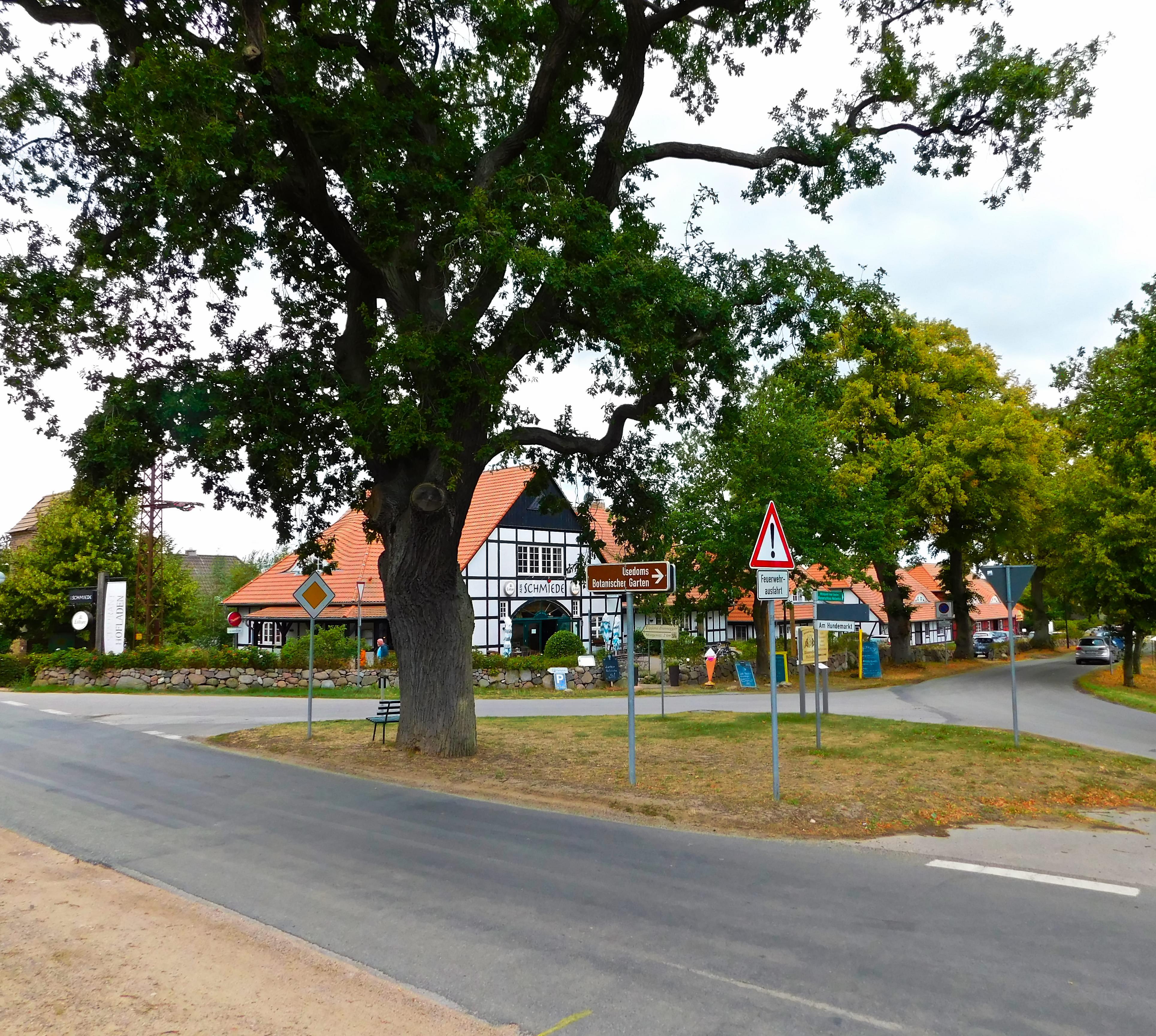 Das beeindruckendste an Mellenthin ist das Wasserschloss mit Brücke über den Schlossgraben, die du nur gegen Brückenzoll überschreiten darfst. Dafür bekommst du aber einen Verzehrgutschein für das Schlossrestaurant. Mellenthin ist einer der wenigen Orte im Hinterland, wo touristisch einiges los ist. Besonders schön ist eine Rieseneiche hinter dem Schloss; von dort gibt es auch gute Wandermöglichkeiten. Das Hotel Wasserschloss Mellenthin bietet deftiges Essen und betreibt auch eine Kaffeerösterei und eine Brauerei. Auf dem Flugplatz des Usedomer Fliegerclubs brechen Fallschirmspringer und Hobbypiloten auf. Wenn du die Insel mal von oben sehen willst, frag doch, ob ein Schnupperflug möglich ist.
