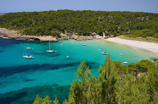 Vom Rückgrat senken sich bis zu 40 m tiefe Schluchten (barrancs) Richtung Küste. Da sie üppig grün sind, werden sie „Menorcas Gärten“ genannt. Wo die Schluchten ins Meer münden, entstanden herrliche, teilweise große Buchten, bedeckt mit weißem Sand. Und zwischen den Stränden stehen eindrucksvolle Klippen. Kein Wunder also, dass sich im Süden mit seinem milden Klima einige der beliebtesten Ferienorte befinden, so Cala Galdana, die langen Strände bei Sant Tomàs/Son Bou und die stille Cala Trebalúger. Über weißem Kalkgestein schimmert das Meerwasser in Türkis und Azurblau – in keinem Werbefilm könnte es schöner sein!