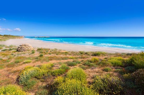 SträndeMit knapp 3 km Länge ist dies der längste Sandstrand Menorcas. Goldgelber, feiner Sand, ein sanfter Abgang ins Meer, Duschen und Toiletten machen ihn ideal für Familien. Im 4.Jh. lag am Ostrand des Strandes vermutlich eine kleine Ortschaft (Luftaufnahmen enthüllen ein Straßenraster im Meer), von der heute nur noch die 1951 wiederentdeckten Reste einer Basilika zu sehen sind.