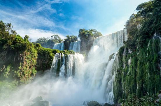 Im Parque Nacional de Iguazú werden Sie Zeuge eines unvergesslichen Naturschauspiels. Die großen Wasser, wie die Guaraní die Wasserfälle nennen, stürzen sich aus 70 m Höhe in die hufeisenförmige Schlucht. Die Front der Fälle, in ein weites Delta mit zahllosen Inseln aufgefächert, misst 2,7 km. Die Luft flirrt vor Hitze, gewaltige Gischtmassen lassen bei Sonnenschein kleine Regenbogen entstehen, die gesamte Gegend ist von einem ständigen Dröhnen erfüllt. Hier, im äußersten Nordosten Argentiniens, fallen jährlich 2000 mm Niederschlag. Nachts steigt die Luftfeuchtigkeit auf 90 Prozent, und die warmen Tagestemperaturen lassen die gesamte Gegend zu einem fruchtbaren Treibhaus werden, in dem die Natur so üppige Formen annimmt wie im Paradies. Der Regenwald bringt gewaltige Baumriesen hervor wie den bis zu 40 m hohen Lapacho Negro sowie zahlreiche Edelhölzer, Bambusgewächse, Guavenbäume und wilde Papayas, Tausende von Ficusgewächsen und unzählige leuchtende Orchideen, Lianen und Kletterpflanzen, Malven mit spinnenförmigen Früchten und grazile Palmen. Schwergewichtige Tapire (300 kg) und kleine Hirsche durchstreifen das Unterholz nach Früchten. Riesige Rudel von Warzenschweinen machen die Gegend unsicher und auf den Bäumen leben Kapuziner- und Brüllaffen. Neun verschiedene Arten von Beuteltieren ernähren sich von Insekten und Früchten. Sie werden selbst zur Beute, wenn Jaguar, Puma, Wildkatze, Berglöwe, Frettchen, Fuchs und Waschbär auf die Jagd gehen. Nachts gehört der Park den Fledermäusen, selbst der Blut saugende Vampir gehört dazu. Tagsüber wimmelt es von Schmetterlingen und Vögeln wie Papageien, Kolibris und Tukanen. Dem Pfefferfresser, Wahrzeichen der gesamten Region, sagen die Guaraní sogar magische Kräfte nach. Man sollte wegen der teilweise giftigen Schlangen keinesfalls in Sandalen durch das Buschwerk laufen. Außerdem ist ein Balsam für Mückenstiche sowie eine Salbe zur Vorbeugung ratsam. Besonders zu empfehlen: Repelente Off, in allen argentinischen Apotheken zu haben. Sechs verschiedene Rundgänge nehmen von 20 Minuten bis zu drei Stunden in Anspruch. Ein offener, gasgetriebener Ökozug fährt die Gäste durch den Urwald zum Ausgangspunkt der Spazierpfade (Estación Cataratas) und zum Steg über den Schwindel erregenden, 80 m hohen Wasserfall der Garganta del Diablo.