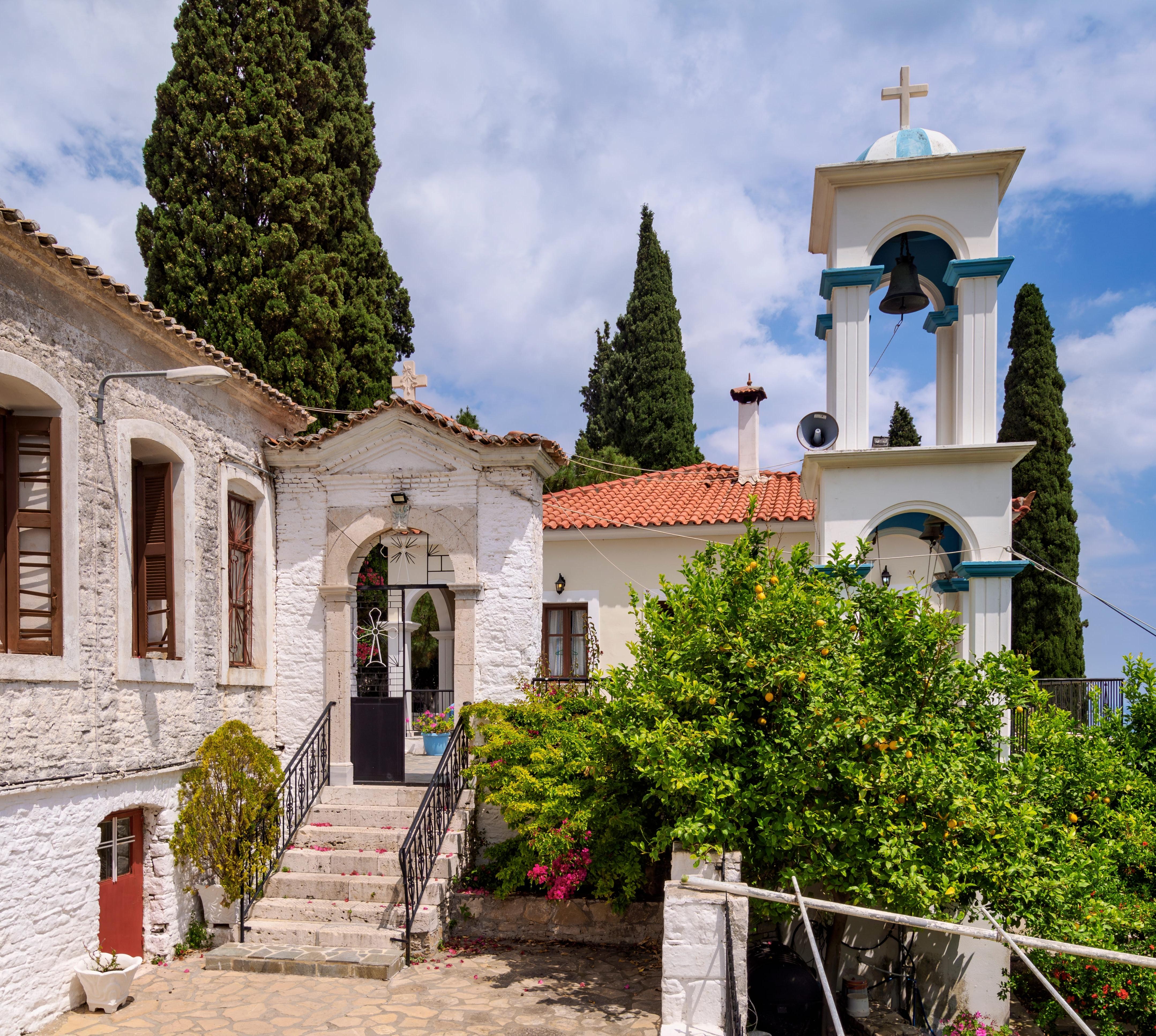 Der weiße Bau dieses Klosters am Stadtberg oberhalb von Pythagório fällt auf. Die Höhlenkirche des Klosters lohnt einen Besuch.