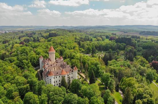 Südwestlich von Prag ließ Karl IV. 1348 auf einem von Wald umgebenen Felsen eine uneinnehmbare Festung errichten - als eine Art riesiger Tresor. Hier wurden die königlichen Schätze und die Kronjuwelen des Heiligen Römischen Reichs deutscher Nation aufbewahrt. Die imposante Festungsanlage bietet einen fantastischen Blick in die Landschaft.