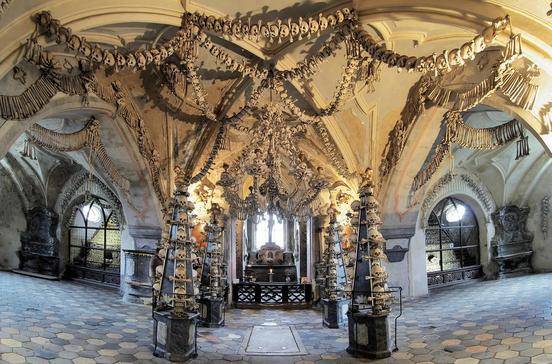 Im Keller einer Friedhofskapelle im Vorort Sedlec sind die Knochen von 40 000 Toten zu Pyramiden, Wappen und Leuchtern zusammengesetzt. Nach Pestepidemie und Hussitenkriegen reichte der Friedhof nicht mehr aus: Die Mönche sorgten mit einer Umbettung für Abhilfe.