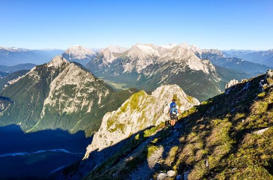 Im Karwendelgebirge gibt es über 125 Gipfel, die über 2000 m hoch sind. Die Kabinenbahn führt hinauf zur Hohen Karwendelgrube auf 2244 m Höhe. Zu Fuß geht man in ca. vier Stunden über den Ochsenboden zur Westlichen Karwendelspitze in 2384 m Höhe.