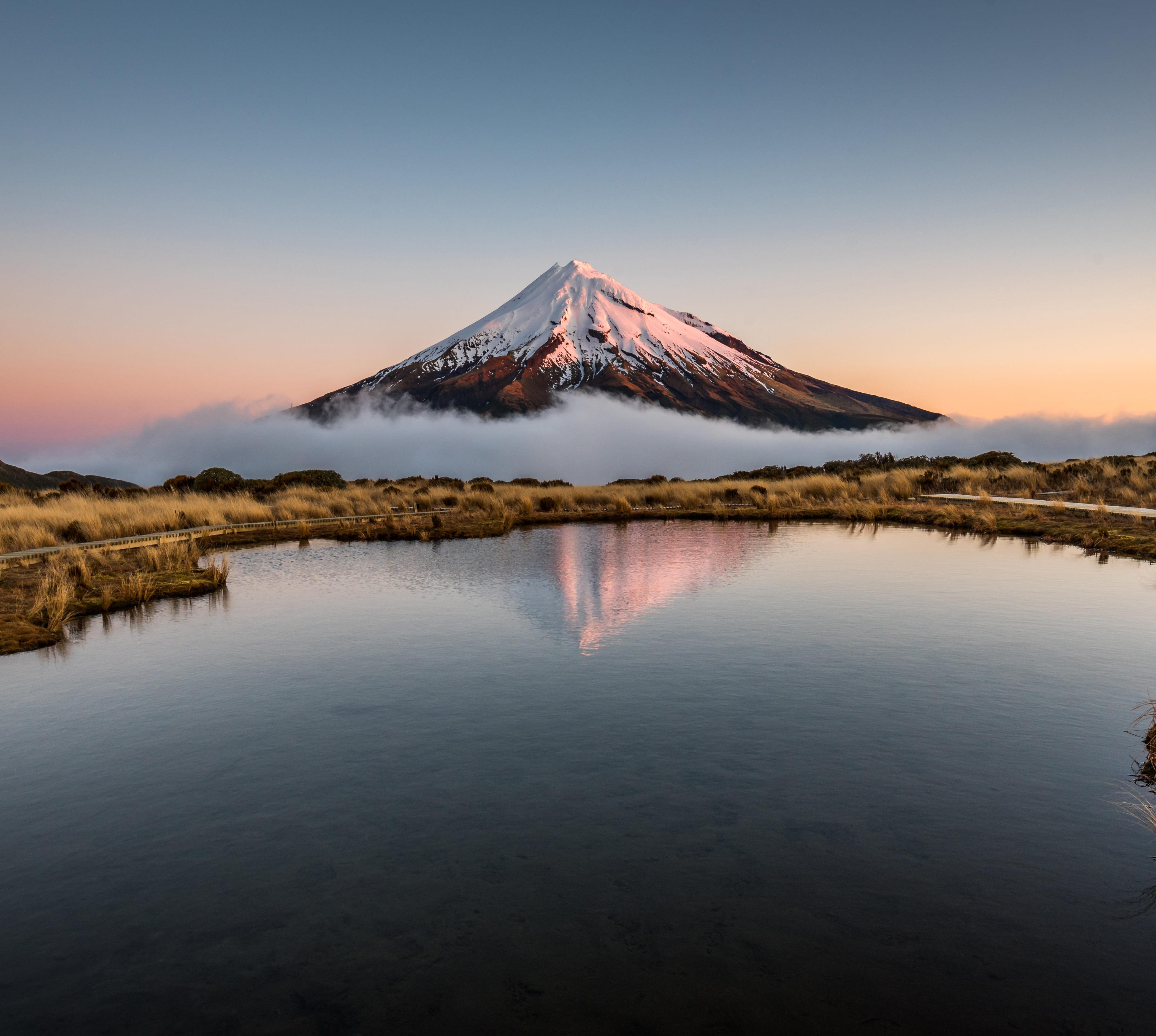Er ist mit 2518 m doppelt so hoch wie der Vesuv und ein äußerst launischer Vulkan: Mount Taranaki (auch Taranaki Maunga oder früher Mount Egmont genannt) ist zwar schon seit über 300 Jahren nicht mehr ausgebrochen, aber das Wetter kann in Gipfelnähe innerhalb von Minuten umschlagen. Touren in unteren Lagen sind aber leicht zu meistern. Oberhalb des Dawson Falls Visitor Centre (Manaia Road | Tel. 027 4 43 02 48 | doc.govt.nz) des Egmont National Park, der den Berg umgibt, startet etwa der 80-minütige Wilkies Pools Loop Track. Er führt durch Märchenwälder voller moosbewachsener Bäume zum Kapuni River, wo du mit Blick auf den Mount Taranaki in versteinerten Lavapools baden kannst. Der beste Ort für Vulkanfotos ist die Aussichtsplattform beim Egmont National Park Visitor Centre (2879 Egmont Road | doc.govt.nz). Zwischen Juni und Oktober kannst du den Vulkan auch auf Skiern und Snowboards hinuntersausen. Etwa 1500 m unterhalb des Kraterrands befindet sich das kleine Skigebiet Manganui (skitaranaki.co.nz) mit mehreren Schleppliften.