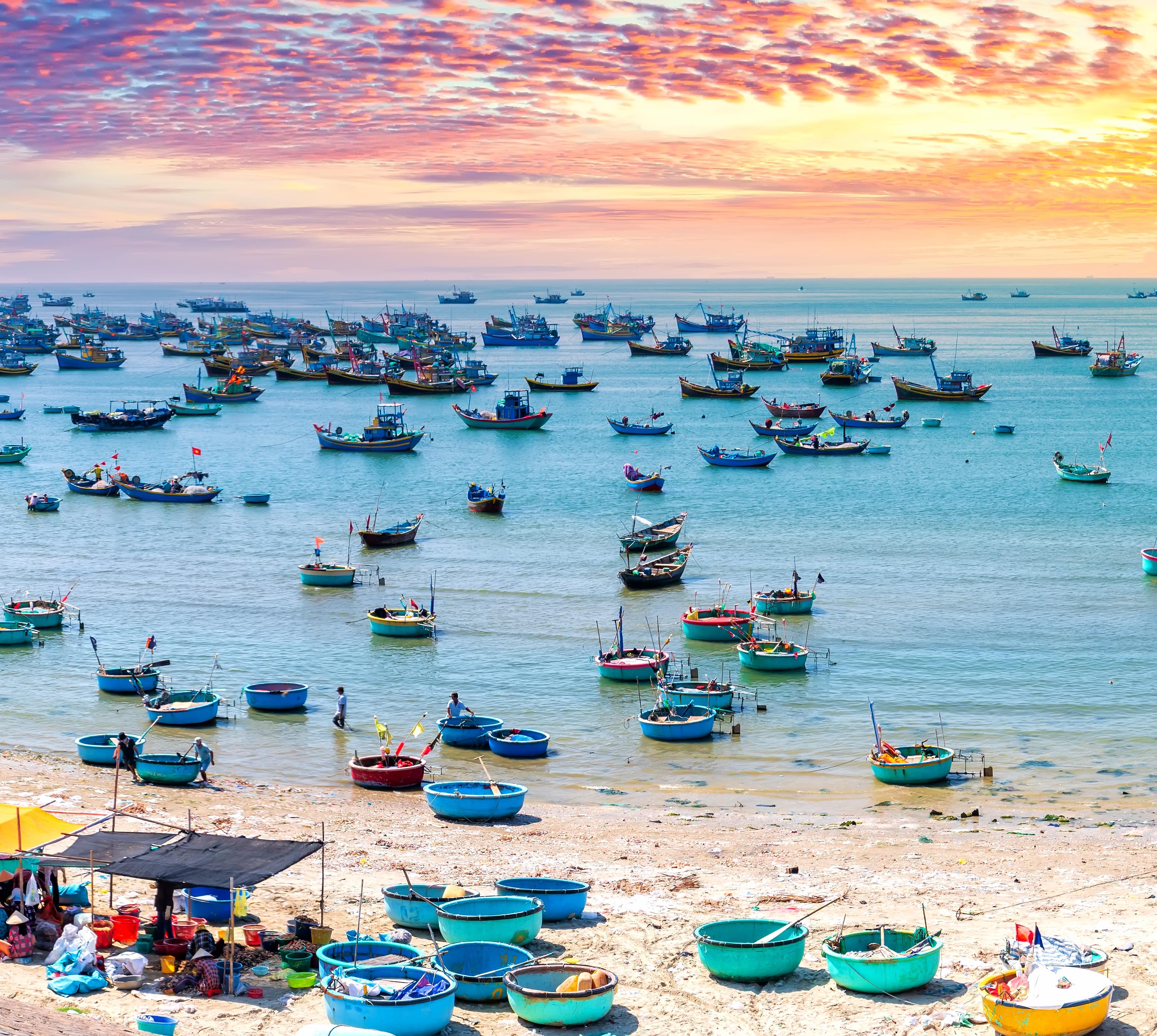 Der kleine Ort Mui Ne hat einen lebendigen Hafen und einige kleine Fischsaucenfabriken. Am Ende der gleichnamigen Halbinsel leuchten rotorangefarbene bis gelbweiße Sandhügel und Dünen (Bao Trang), die mit Jeeps, Quadbikes oder zu Fuß (feste Schuhe anziehen, der Sand glüht schon um 9 Uhr morgens) erobert werden.