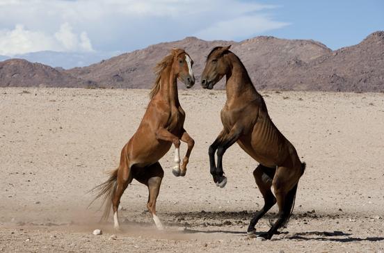 Etwa 225 wilde Pferde leben am Rand der Namib. Am besten beobachten kannst du sie an der künstlich angelegten Garubpfanne östlich von Lüderitz an der B 4, ihrer einzigen Wasserstelle. Die Tiere sind Nachkommen von entlaufenen Trakehnern der Schutztruppe, Burenpferden der südafrikanischen Armee und anderen Ausreißern, die inzwischen zu einer einzigartigen Rasse verschmolzen sind. Ohne künstliche Wasserversorgung würden sie jämmerlich verdursten, da es in ihrer Reichweite keine natürliche Quelle gibt. Trotzdem leben sie wild und sollten nicht gefüttert oder gestreichelt werden.
