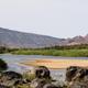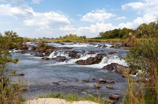 Die Popa Falls sind zwar kein Wasserfall, sondern Stromschnellen – der Fluss fällt hier relativ abrupt im felsigen Flussbett um etwa 2,5 m ab –, doch ein Besuch des Wildschutzgebietes lohnt sich auch ohne donnernde Wassermassen. Einen schönen Blick auf die Stromschnellen hast du von der White Sands Lodge and Camping auf der gegenüberliegenden Flussseite. Als Tagesgast ist das die bessere Option, die Popa Falls zu sehen, neben sechs Campsites stehen dort inzwischen auch drei nagelneue Chalets.