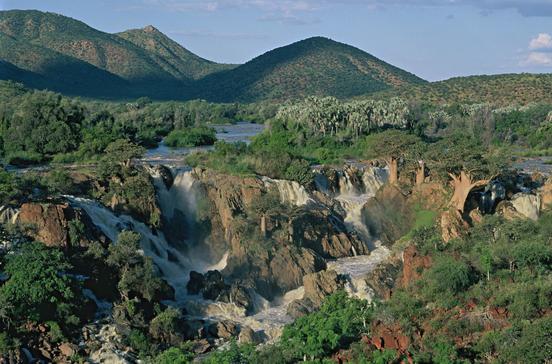 An den Epupa Falls stürzt der Kunene auf insgesamt 700 m Breite inmitten ansonsten karger strauchlandschaft rauschend und schäumend 35 m in die Tiefe. Nördlich des Flusses liegt Angola, südlich das namibische Kaokoveld. Am Abgrund der Fälle klammern sich Affenbrotbäume an die Felsen, die kleinen Inseln und Ufer des Stroms sind gesäumt von Makalanipalmen, aus deren Samen die Einheimischen Souvenirs schnitzen. Im Mai, nach der Regenzeit, ist das Schauspiel der Wasserfälle am eindrucksvollsten, der Anblick zum Sonnenuntergang majestätisch.
