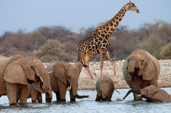In einer meterhohen Staubwolke tobt eine Herde Gnus durch den Etosha National Park. Ein paar Springböcke stieben mit ihren typischen Hüpfern davon, nur knapp 500 m weiter liegt ein Rudel Löwen im hohen Gras, das gigantischen Zebraherden als Weide dient. In der anschließenden Dornstrauchsavanne ragen Dutzende Giraffenhälse in den Himmel – das ist Wildnis wie aus dem Bilderbuch. Der Nationalpark, der bereits 1907 gegründet wurde, ist Namibias berühmtester und mit 22 912 km2 einer der größten in Afrika. Wer die Möglichkeit hat, genießt die Ruhe, die hier in der Nebensaison herrscht. Von Juli bis November geht es im Etosha National Park relativ geschäftig zu. Dann weichst du am besten in den ruhigeren Nordosten des Parks aus. Nahe dem King Nehale Gate sind auch die Chancen am größten, Elefanten zu sichten. Mit dem eigenen Mietwagen bist du hier gut unterwegs, Parkkarten gibt es an den Rezeptionen in den Camps zu kaufen.