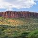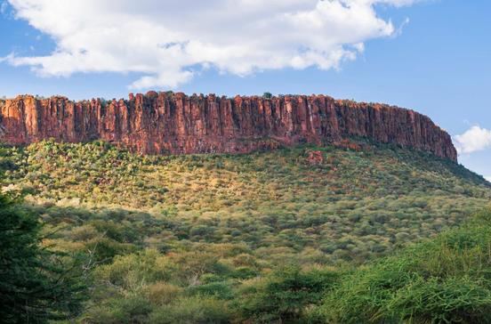 Wie ein Tisch erhebt sich das Plateau mehr als 200 m hoch über die flache Savanne der Kalahari 100 km östlich von Otjiwarongo. An seinem Fuß sprudeln Quellen und sorgen für grüne Hänge. Hochebene und Umland sind als Nationalpark geschützt, oben leben Nashörner, Büffel und seltene Antilopenarten.