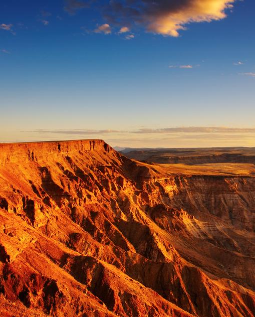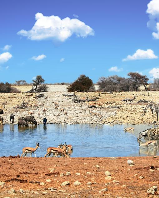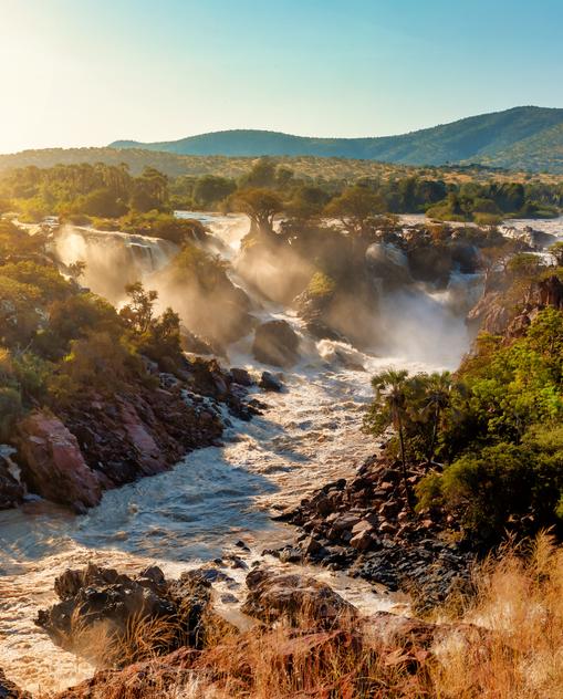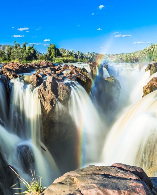 2 km nach dem Abzweig endet der schmale Schotterpfad in einer schlammigen Senke, an deren Ende eine Gischtwolke auf das Naturschauspiel aufmerksam macht. Unter kräftigem Rauschen fällt der Fish River, der sich ansonsten unauffällig wie eine scheue Wasserschlange durch die mal steinig-harsche, mal sandig- flache Landschaft schlängelt, an einer Felskante 10 m in die Tiefe. Wie zum Beweis für die Unberechenbarkeit der Region zieht wenig später ein kurzer Regenschauer auf, dessen Tropfen im Sonnenlicht einen doppelten Regenbogen über die endlose Weite der Kalahari spannen. Namibia ist ein Land unerwarteter Kontraste, und wäre der Titel nicht bereits vergeben, ließe es sich auch als Land der unbegrenzten Möglichkeiten bezeichnen. „Unbegrenzt“ ist das Stichwort für die Naturparks und Schutzgebiete Namibias. In der nördlichen Namib können Wüstenelefanten wieder ungestört von Zäunen und Jägern ihren natürlichen Migrationsrouten folgen, die sich am Wasser orientieren und fest im Gedächtnis der Leittiere verankert sind. Mit den Elefanten genießen immer mehr Nashörner, Antilopen, Zebras, Löwen und Leoparden die Freiheit.