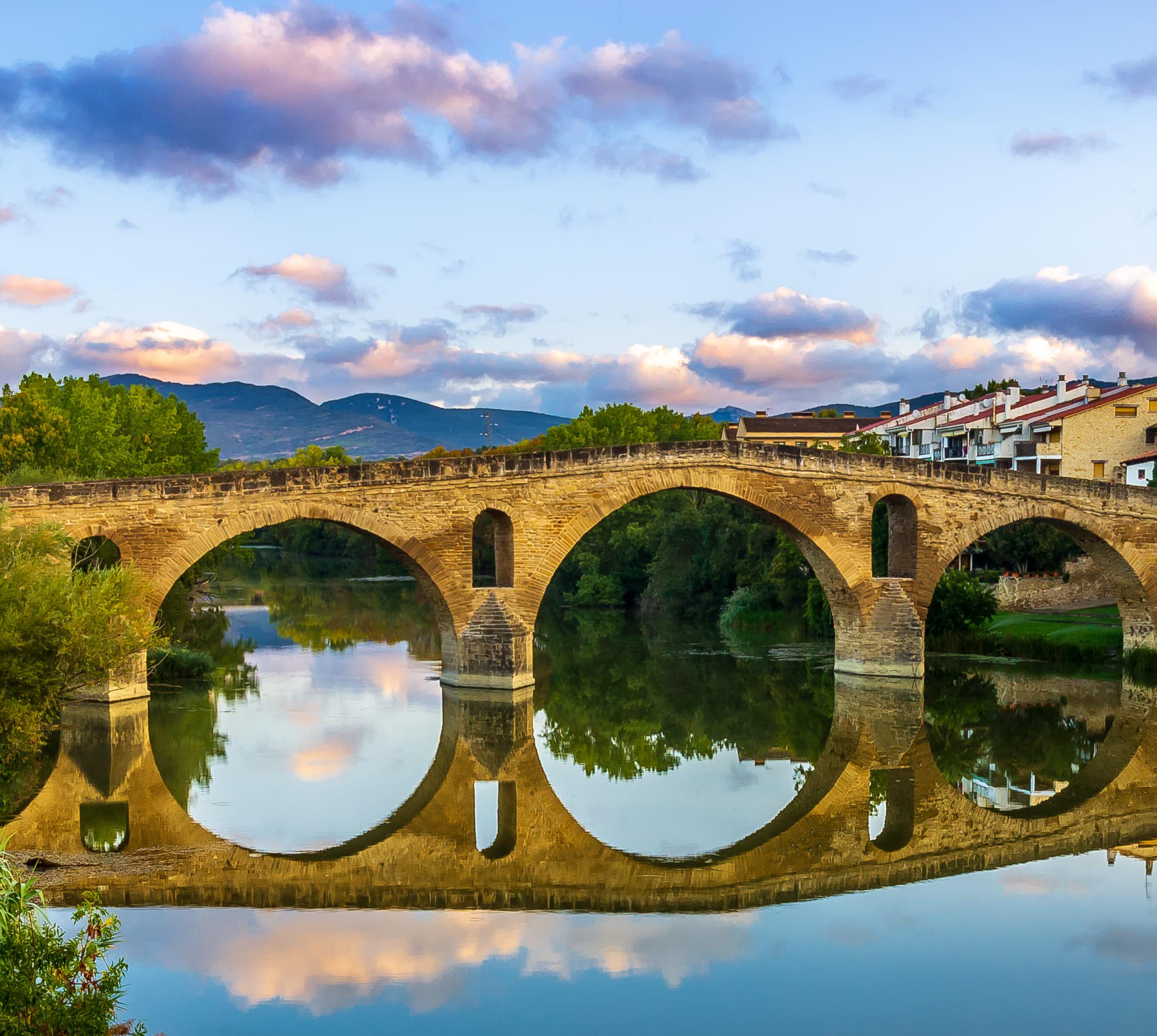 In der größten Stadt am Camino schlagen im Juli die Fiestawogen hoch, aber auch sonst findest du in der Universitäts- und Regionalhauptstadt eine coole Gastroszene, spannende Museen und ein lebendiges Nachtleben. Zwischen Pamplona und Logroño zeigt der „kleine Kontinent“ Navarra, warum er diesen Beinamen verdient. Ob die berühmte Brücke von Puente la Reina, die Kirchen von Estella, die Dörfer, Spargelfelder und Rebgärten am Wege – sie alle runden das Bild bis in die Rioja hinein ab. Ab Anfang des 10.Jhs. war Navarra eigenständiges Königreich und wurde erst im 16.Jh. von den Truppen Kastiliens überrollt. Heute zählt die Region zu den wohlhabendsten im Land, was sich auch in höheren Preisen niederschlägt.