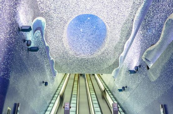 Die elf Kunstbahnhöfe der U-Bahn-Linie 1 stehen ganz oben auf der Liste der neapolitanischen Sehenswürdigkeiten. Preisgekrönt sind die Stationen Toledo, Dante und Museo – u.a. gestaltet von William Kentridge, Jannis Kounellis, Robert Wilson, Oliviero Toscani und Joseph Kosuth. Für den Preis eines Metrotickets gibt es zeitgenössische Kunst vom Feinsten. Folg in der Station Toledo dem Ausgang Montecalvario: Auf dem Laufband fährst du an Neapolitanern vorbei, die der Fotograf Oliviero Toscani an der Wand verewigt hat.