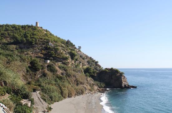 Der größte Strand Nerjas bietet grobkörnigen Sand, einige Restaurants an der angrenzenden Promenade, Duschen, Kinderspielgeräte, Tretboote und schöne Blicke ins Hinterland und küstenwärts nach Osten.