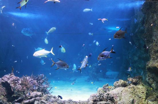 In tiefen Plastiktunneln wanderst du durch den Ozean. Überwältigend: das künstliche Barrier Reef mit tropischen Fischen und klassischer Musik.