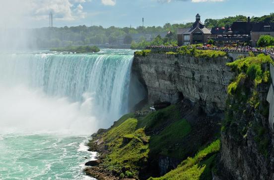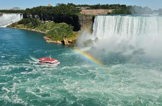 Die 54 m hohen kanadischen Horseshoe Falls sind weit beeindruckender als die 56 m hohen, 323 m breiten American Falls, da sie sich in weitem Bogen 670 mim Halbrund spannen. Die schönsten Aussichtspunkte liegen auf kanadischem Ufer am Table Rock House und auf der amerikanischen Seite auf Luna Island. Abends farbige Illumination.