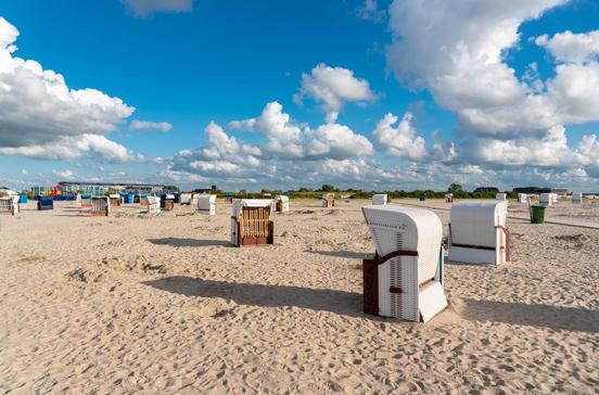 Der großzügige Strand ist mit zahlreichen Strandkörben ausgestattet und bietet eine schöne Aussicht auf die umliegenden Inseln. Vom Strand aus ist ein großer Spielplatz und das Meerwasser Freibad schnell fußläufig zu erreichen.