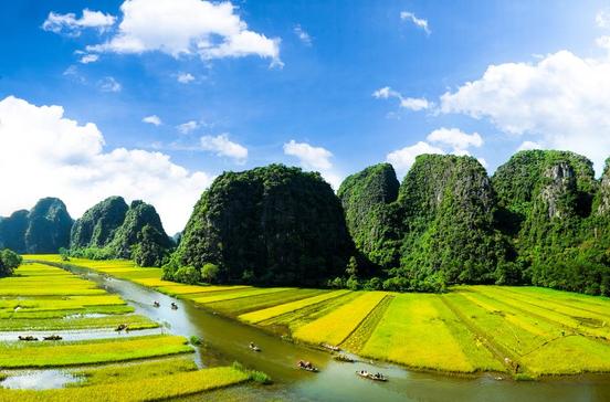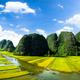 Aus dem dunklen Grün der Umgebung ragen bewaldete Kegel, Felsspitzen und Bergrücken abrupt und scheinbar ohne Sockel empor: Kein Wunder, dass sich diese sagenhafte Turmkarstlandschaft schnell zu einer touristischen Attraktion entwickelte. Die im Lauf von Jahrmillionen entstandenen Kalksteinformationen nehmen es an Schönheit mit der Ha-Long-Bucht auf - mit dem Unterschied, dass das Wasser fehlt. Im Herzen der spektakulären Landschaft liegt die Provinzhauptstadt Ninh Binh. Früher glich sie trotz ihrer rund 50.000 Einwohner eher einem beschaulichen Dorf. Das hat sich geändert, seit vor allem Individualreisende die Gegend entdeckt haben. Sehr beliebt ist der kleine Ort Tam Coc, wo die Boote für Touren ablegen.