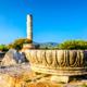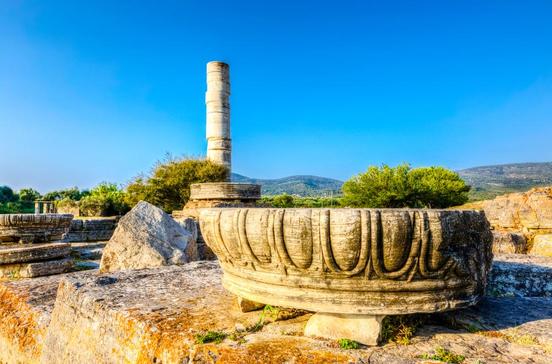Du musst ein wenig Fantasie mitbringen, um zu verstehen, warum das Heraion als das wichtigste Heiligtum der Insel gilt und gemeinsam mit den Überresten der antiken Stadt in Pythagório zum UNESCO-Weltkulturerbe zählt. Deutsche Archäologen arbeiten seit 1952 an der Freilegung, haben aber weder ein Delphi noch einen zweiten Athener Parthenon ausgehoben. Das Einzige, was hier heute noch über die Grundrisse herausragt, ist eine 10 m hohe Säule, die ursprünglich doppelt so hoch war. Immerhin ist sie namensgebend: Die Samioten nennen den Ort auch kolónna (Säule). Interessant wird das Heraion erst so richtig, wenn du dich mit der Geschichte auseinandersetzt. Schon zu mykenischer Zeit, also vor etwa 4000 Jahren, wurde an diesem Ort eine Fruchtbarkeitsgöttin verehrt. Um 1000 v. Chr. ließen sich dann ionische Griechen auf Sámos nieder. Sie konnten mit der Fruchtbarkeitsgöttin nichts anfangen und weihten den Ort ihrer höchsten Göttin Hera. Anfangs stand hier wohl nur ein einfacher, offener Schrein zur Aufnahme eines Kultbilds aus Holz. Im 8 Jh. v. Chr. erbaute man dann mit 33 m Länge und 7 m Breite einen eher kleinen Tempel aus Lehmziegeln, der mit Tonziegeln gedeckt war. Ob Sámos‘ Aufstieg im 6.Jh. zu einer der mächtigsten Inseln der Ägäis der Hilfe Heras zu verdanken war, kann niemand beweisen. Fest steht, dass man den wachsenden Reichtum der Stadt auch in diesem Heiligtum zur Schau stellen wollte. Man engagierte die Architekten Rhoikos und Theodoros, die den Tempel nach zehn Jahren Bauzeit vollendeten. Er wurde zwölfmal größer als der Vorgänger, 105 m lang und 52 m breit. Seine Ringhalle, also der Kranz um das Mauerwerk der Cella, bestand aus einer Doppelreihe von 21 Säulen an den Längs- und 8 bzw. 10 Säulen an den Breitseiten. So viele Säulen an einem Ort müssen schon damals mächtig Eindruck gemacht haben. Lange konnte man mit der Anlage aber nicht prahlen: Schon nach 30 Jahren brannte der Tempel nieder, als der hölzerne Dachstuhl Feuer fing. Eine gute Gelegenheit für den damals herrschenden Tyrannen Polykrates, sich mit einem noch größeren Bau unsterblich zu machen. Seine Vision sollte mit einem 108 m langen und über 55 m breiten Tempel Gestalt annehmen. Fertiggestellt wurde er jedoch nie. Den besten Überblick bekommst du, wenn du zur Säule läufst. Von hier aus kannst du die Grundrisse des Tempels recht gut erkennen. Östlich des Tempels wirst du ein Gewirr von Grundmauern sichten, die zu drei unterschiedlichen Bauwerken gehörten: zu einer kleinen, frühchristlichen Kirche, zu einem Tempel aus römischer Zeit und zum großen Hera-Altar, auf dem der Göttin Tiere als Brandopfer dargebracht wurden. Was da je nach Jahreszeit blau blüht, ist ein Keuschlammstrauch – die Lykos-Baum genannte Pflanze, die Hera heilig war. Damit man auf dem Weg von Sámos-Stadt zum Hera-Heiligtum nicht über Gestrüpp stolperte, baute man eine Straße. Ein Stück davon ist erhalten, du findest es direkt an der Ausgrabungsstätte. An der Nordseite standen dort, wo man heute wohl Souvenirshops und Imbissbuden errichten würde, mehrere kleine Tempel. Auf beiden Seiten ging man an Statuen und Weihgaben vorbei. An der Stelle, wo die berühmte Geneleos-Gruppe aufgestellt war, befindet sich heute eine Kopie; das Original ist im Archäologischen Museum von Vathý zu sehen.