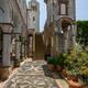 Architektonische HighlightsIn der blendend weiß gekalkten Kreuzkuppelkirche Agía Matróna am südlichen Rand des alten Ortes sind wahrscheinlich aus dem 18.Jh. stammende Fresken hervorragend erhalten. Besonders schön sind die Darstellungen der Schöpfungsgeschichte an der linken und rechten Seitenwand. Links erkennt man die Erschaffung Adams und der Tiere und sieht, wie Gott Eva aus der Rippe Adams entstehen lässt. Rechts sieht man den Sündenfall, die Vertreibung des Paars aus dem Paradies und ihre Söhne Kain und Abel.