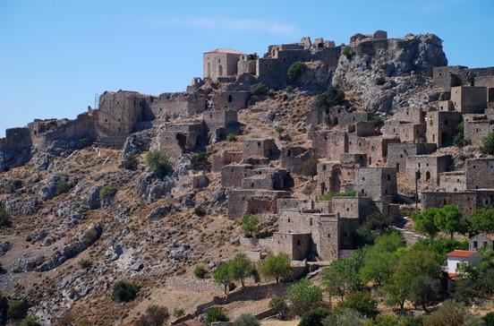 Dieses bis vor Kurzem weitgehend verlassene Bergdorf, in dem jetzt Athener und Ausländer die Häuser wiederherrichten, nimmt den oberen Hang eines nach zwei Seiten steil abfallenden Granitfelsens ein, der im Mittelalter von einer Burg gekrönt war. Über 400 Häuser samt Schule, Ölmühle und Kirche bildeten einst den Ort, der schon 1822 zur Geisterstadt wurde.