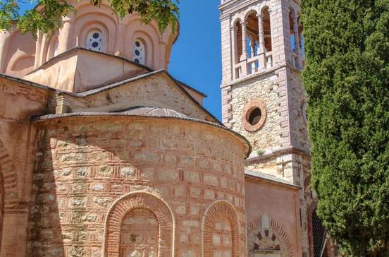 Das bereits im 11.Jh. gegründete Kloster in den Bergen wirkt wie eine Festung. Heute ist es von Nonnen bewohnt. Die Klosterkirche birgt prächtige byzantinische Mosaike aus dem 11.Jh. Sie wurden von Künstlern aus der Reichshauptstadt Konstantinopel geschaffen. Neben dem Klostertor sind in Wandschränken Gebeine und Schädel der Mönche ausgestellt, die beim türkischen Massaker auf Chíos 1822 zu Tode kamen.