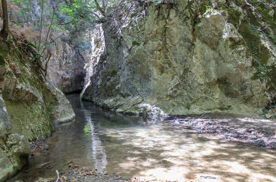 Folge dem Bachtal, gelange nach ca. 15 Minuten an eine Schlucht, die völlig vom Bach eingenommen wird. Springe ins eiskalte Wasser und schwimme den Bach etwa 40 m aufwärts, dann erreichst du einen ca. 2 m hohen Wasserfall. Wenn du ihn hochkletterst, gelangst du noch zu zwei weiteren Wasserfällen.