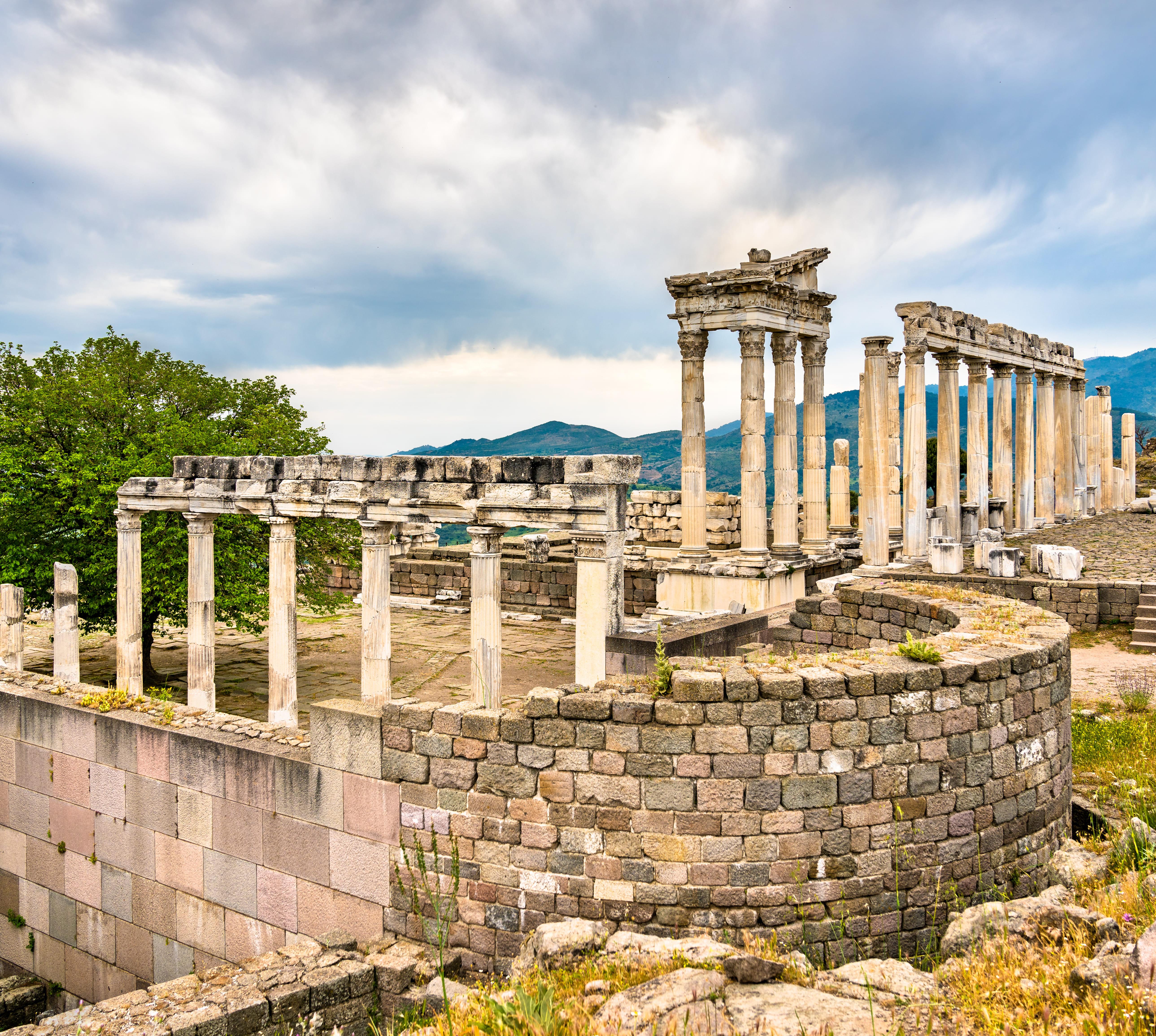 Die Ruinen der antiken Stadt Pergamon liegen auf einem Berg oberhalb der Stadt Bergama. Hier war das Zentrum des Pergamenischen Reiches (263-133 v.Chr.), wo Handel und Künste blühten. Berühmt war die 200.000 Schriftrollen umfassende Bibliothek der Stadt. Das Pergament (hauchdünne, ungegerbte Tierhaut) wurde hier erfunden. Der Relieffries des Altars, Ende des 19.Jhs. von Carl Humann entdeckt, befindet sich heute im Berliner Pergamonmuseum. Aber auch ohne Altar gibt es viel zu bewundern: z.B. die Akropolis und das am Hang steil abfallende riesige Theater Asklepion. In den 80 Reihen des Auditoriums fanden bis zu 15.000 Menschen Platz.
