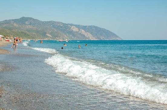Eingebettet in grüne Hügel liegt das 100 m lange Kieselsteinband der Kervéli-Bucht direkt der Türkei gegenüber. Große Tamarisken spenden der Hälfte des Strandes angenehmen Schatten. An dem Hang dahinter liegt ganz ruhig inmitten von Olivenbäumen und Zypressen das auch architektonisch ansprechende Hotel Kervéli Village mit Pool und Tennisplatz.