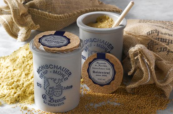 Besuchen Sie im wunderschönen Eifelstädtchen Monschau die durch Funk und Fernsehen bekannte Historische Senfmühle anno 1882.Hier mischen in der 4.und 5.Generation Senfmüller Guido Breuer und seine Tochter Ruth nach überlieferten und eigenen Rezepten den berühmten Moutarde de Montjoie, den Monschauer Senf, derzeit in 21 verschiedenen Sorten. Zwischen alten Mühlsteinen wird noch heute – wie in alter Zeit – Senf handwerklich und in bester Qualität auf kaltem Wege hergestellt. Es gibt scharfe Sorten wie Kaisersenf, Grüner Pfeffer oder Chili, süßen Senf (Honig-Mohn, Feige, Riesling oder Tomate) und auch fruchtigen (Limone, Orange, Johannisbeer) – Sie finden etwas für jeden Geschmack.