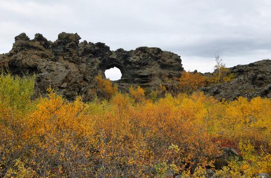 Die Lavaformationen Dimmuborgir bilden eine fantastische Welt. Hier befinden sich Tunnel und Höhlen mit Namen wie "kirkjan" (Kirche) und im Sommer kann man hier auf einer Felsformation namens "Stuhl des Weihnachtsmanns" Platz nehmen. Die Lavaskulpturen inmitten einer üppigen Vegetation sind bis zu 40 m hoch. Der nördlich liegende Krater Hverfjall hat einen Durchmesser von 1 km und ist 140 m hoch - der größte Krater Islands. Das ganze Gebiet steht unter Naturschutz.